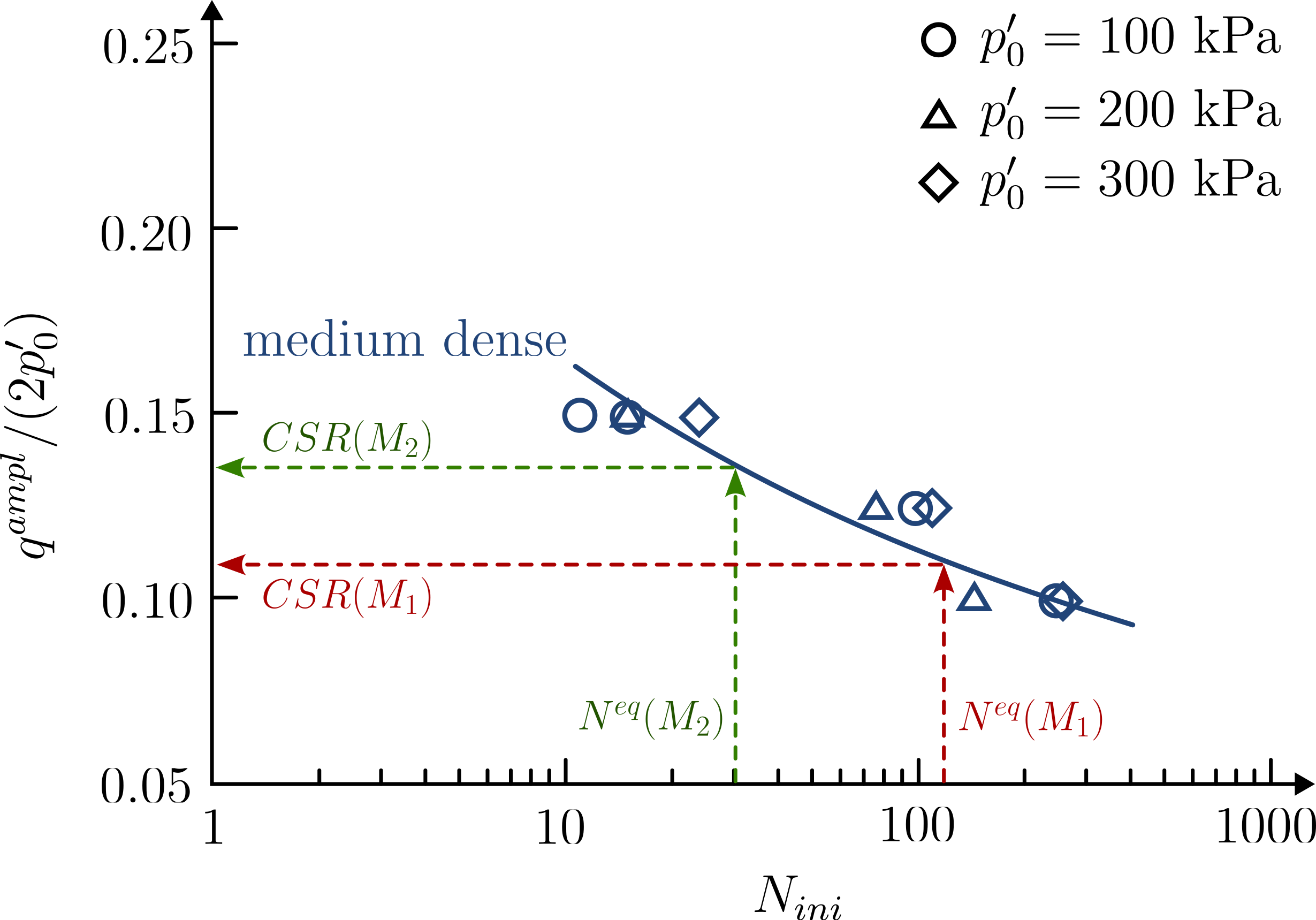 Since soil behaviour under (undrained) cyclic loading is highly sensitive to its state (density, stress, structure, ...) care must be taken when performing the cyclic tests forming the basis of the \(N-CSR\) curves used to evaluate the liquefaction resistance. If possible, undisturbed samples should be used (e.g. frozen soil samples). If not possible, disturbed samples should be prepared to reflect in situ soil formation as closely as possible.