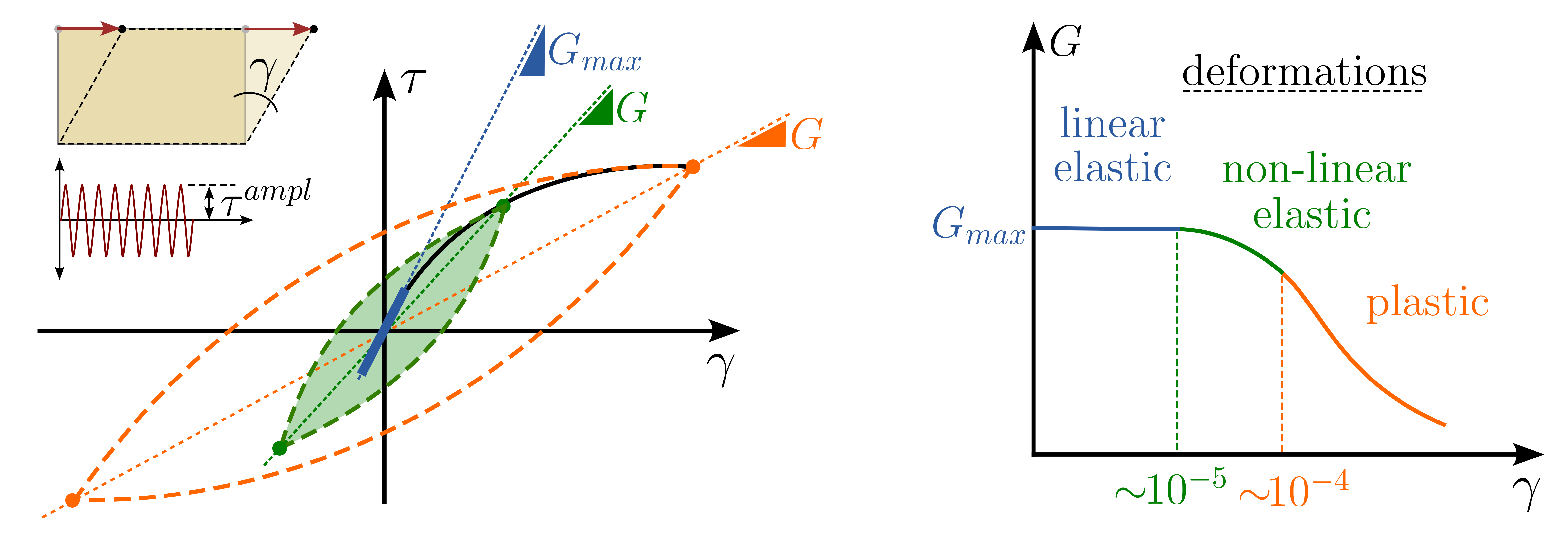 Given that small strains are predominant in most soil dynamics problems, it is usual to consider soil as exhibiting non-linear (but) elastic behavior. This non-linearity stems from the shear stress-shear strain relationship's inherent non-linear characteristics. The figure below qualitatively demonstrates this relationship, as observed in a simple shear test. For a monotonically increasing initial load, the soil's base stiffness diminishes progressively between load points. This change in stiffness can be quantified either by the tangent modulus (the tangent at the load point) or by the secant modulus (the secant between the origin and the load point). The maximum shear modulus at the start of loading, denoted as \(G_{max}\), represents the peak stiffness for small deformations under a monotonic initial load. When the strain amplitude exceeds this point (\(\gamma \approx 10^{-5}\)), the material response remains elastic (i.e., no plastic strains are formed), but the secant shear modulus diminishes. Plastic strains, along with a continuing reduction in the secant shear modulus, emerge once the strain surpasses a specific threshold (\(\gamma \approx 10^{-4}\)). A typical relationship for \(G-\gamma\) is illustrated on the right-hand side of Figure 11.