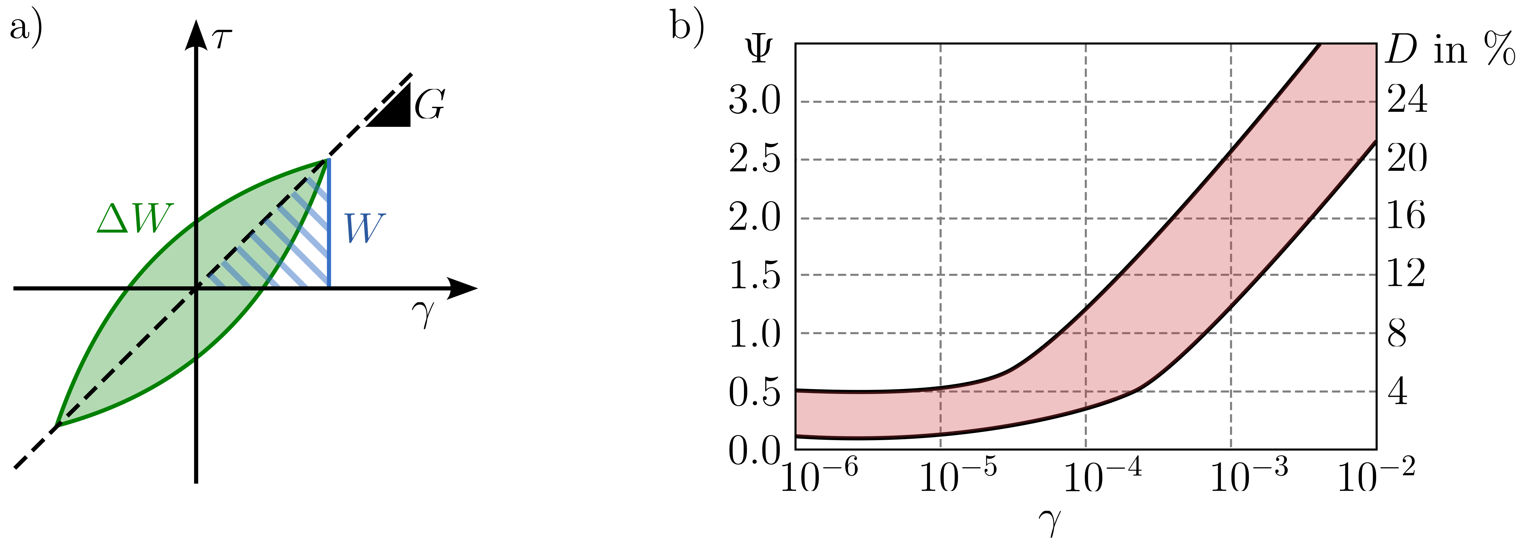 The material damping results from the ratio of the dissipated energy during a single cycle \(\Delta W\) to the elastic storage energy \(W\) (the elastic energy at the maximum shear strain during that cycle.). For an illustration of \(W\) and \(\Delta W\) refer to Figure 13 a). The damping properties are usually provided by means of the damping capacity \(\Psi\) or the damping ratio \(D\):
