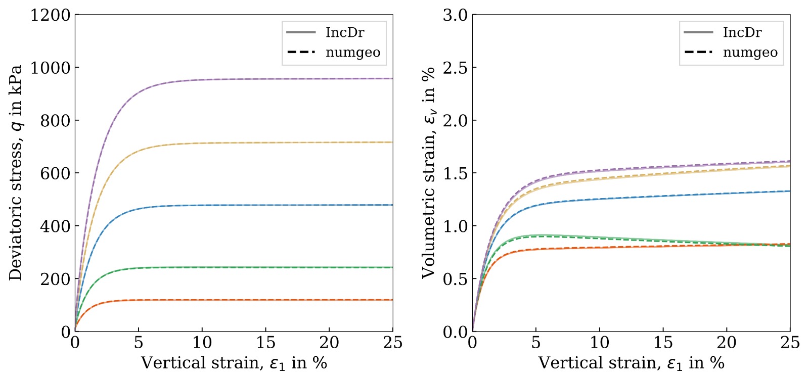 The agreement between numgeo and the reference solution is excellent in both the \(p'\)–\(q\) and \(\varepsilon_{\text{ax}}\)–\(q\) (with \(\varepsilon_1=\varepsilon_{ax}\)) planes.