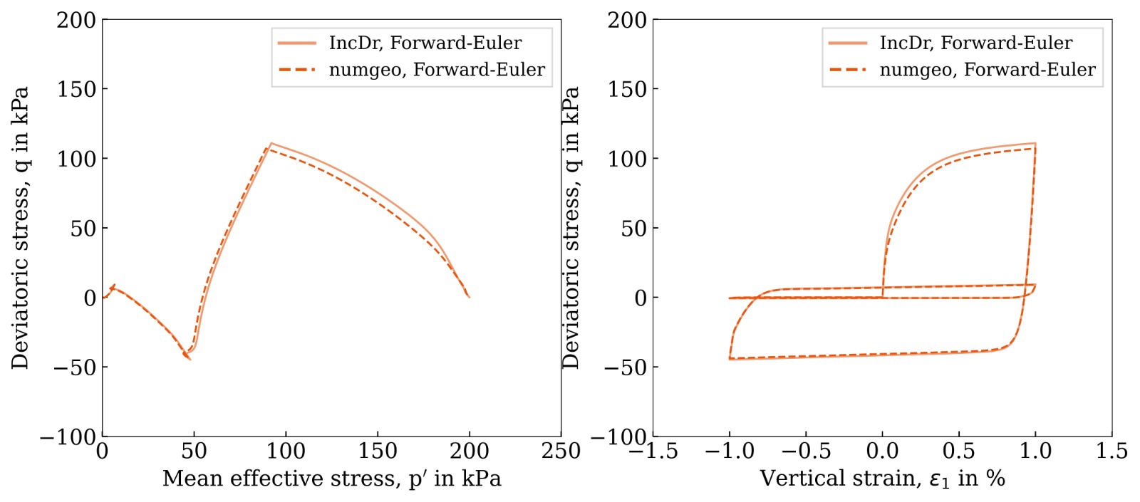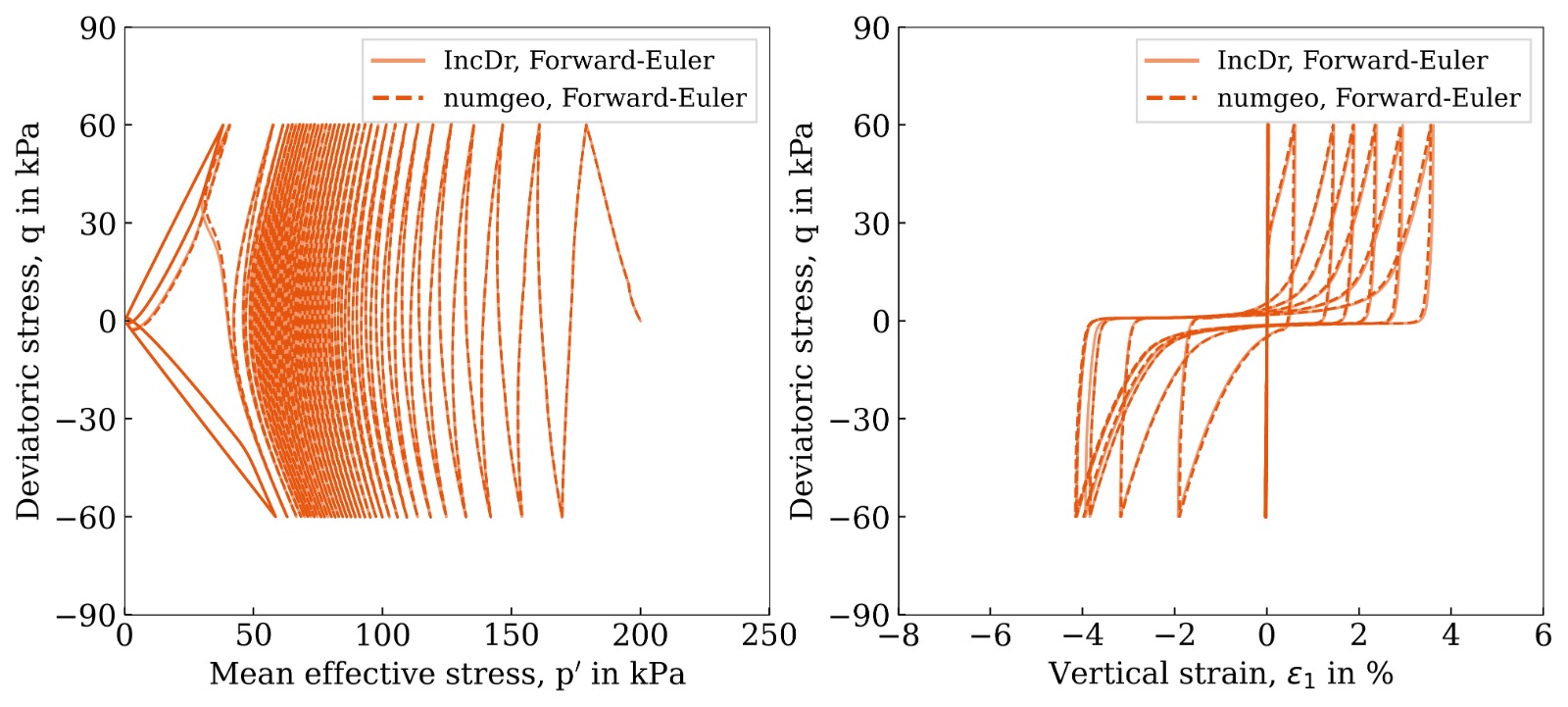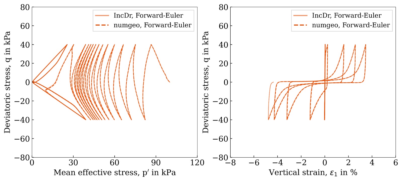 Figure 1: Undrained cyclic triaxial test — comparison of the numgeo implementation (Euler–Richardson) with the reference solution using Incremental Driver by Tafili et al. (2025)1.