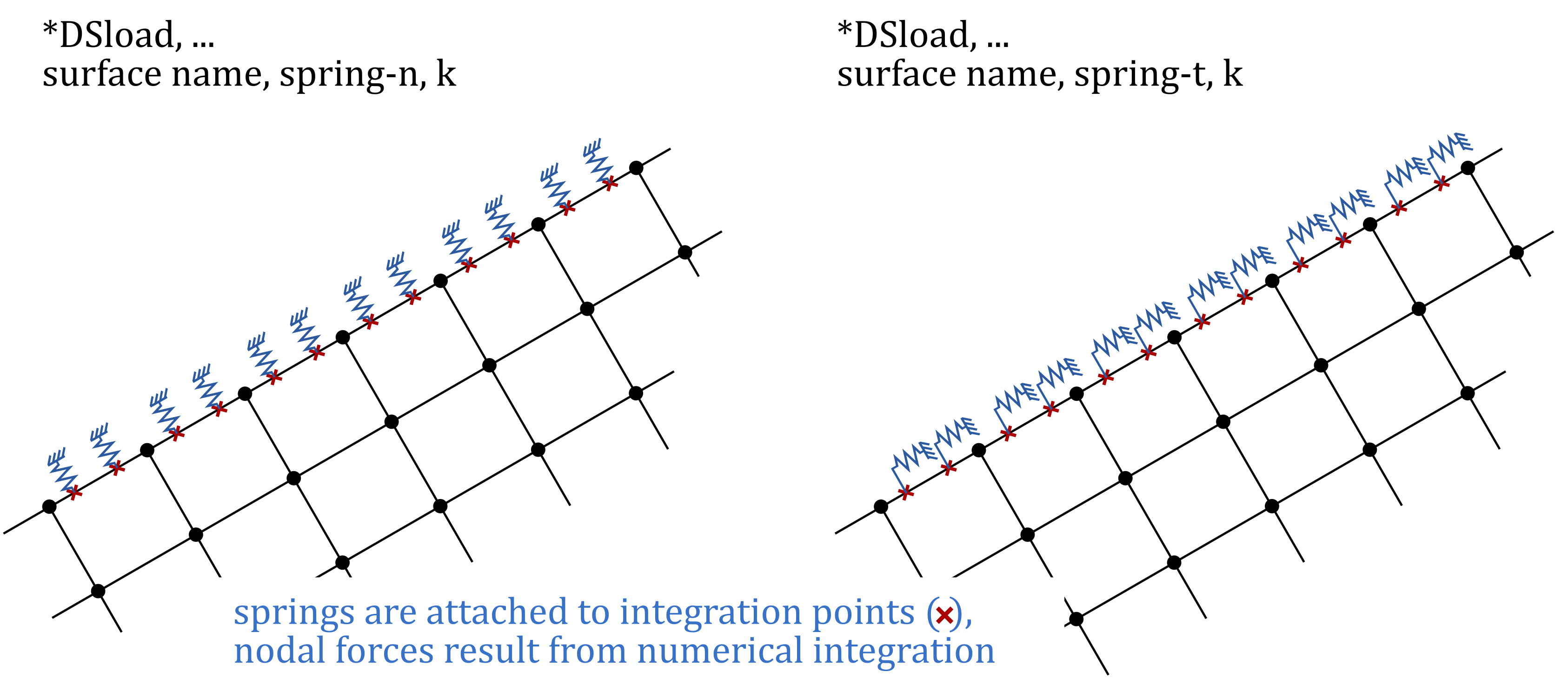 Springs that are defined as distributed surface loads (DSloads) attach at the integration points of the element edges/faces forming the surface to which they are assigned to. The resulting nodal forces are obtained by means of numerical integration.