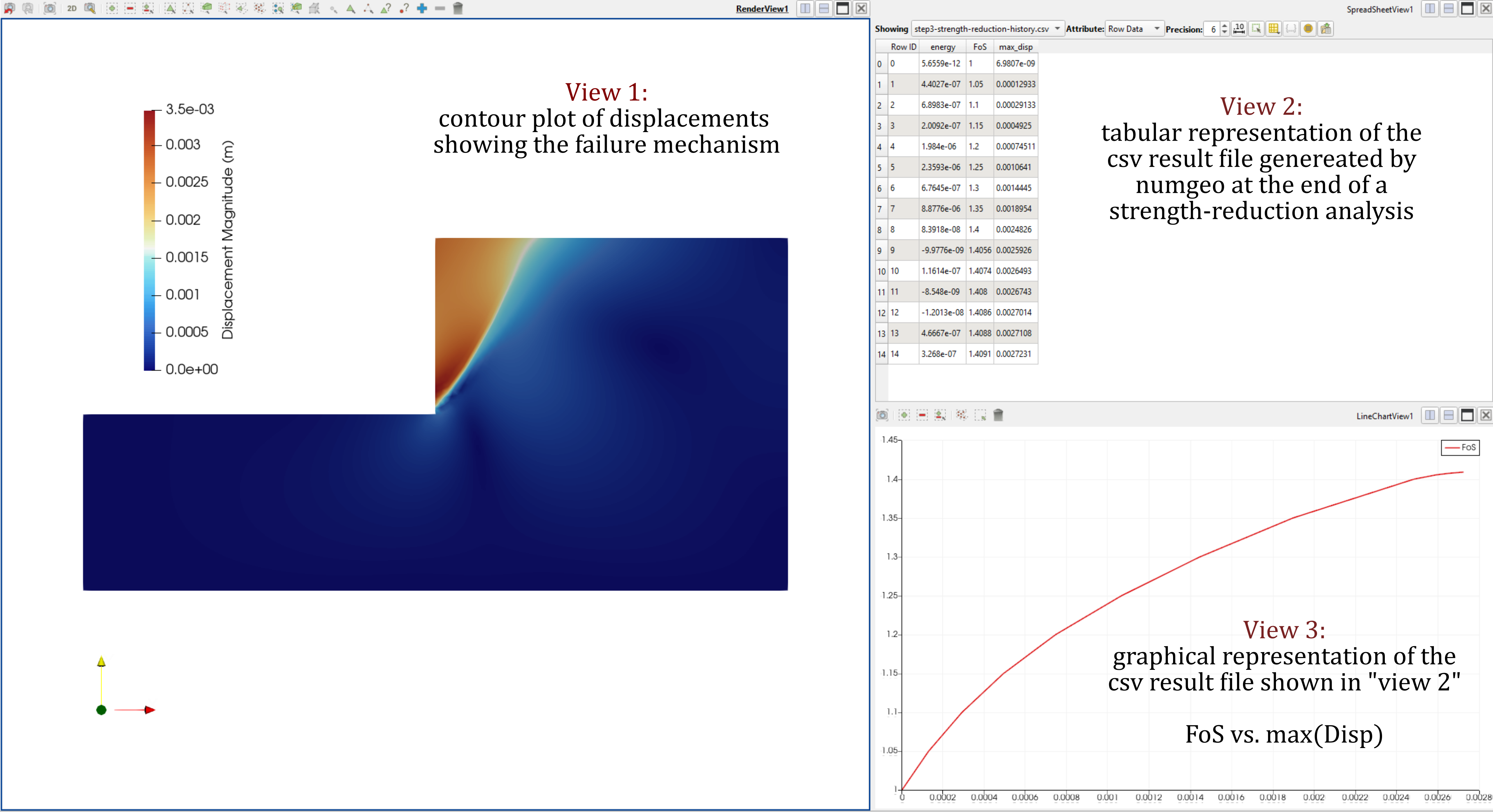 , numgeo uses an automatic procedure to determine the Factor of Safety (FoS) for the current system by incrementally decreasing (and increasing) the shear strength parameters.