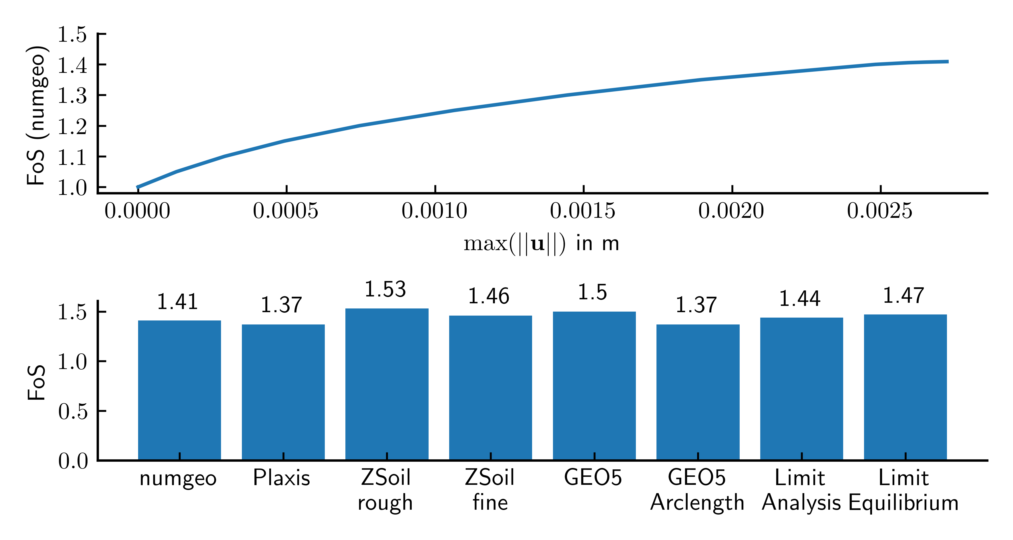 The resulting Factor of Safety (FoS) obtained with numgeo is compared to the results of the five different software packages (and analysis methods) in Figure 3. It can be seen that the results obtained with numgeo are within the range of results obtained with other software and are close to the once obtained with Plaxis.